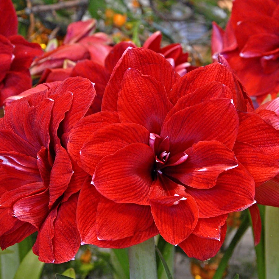 Луковицы Амариллиса гибридного Дабл Драгон (Double Dragon) образуют цветы удивительной красоты: на мощном цветоносе раскрываются до 5 огромных, многослойных бутонов ярко-алого цвета с белыми искорками на кончиках листьев. Диаметр раскрытого цветка достигает 20 сантиметров. Широкие остроконечные лепестки расположены в несколько рядов, придавая цветку дополнительный объем.