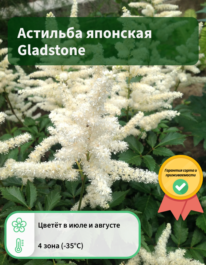 Рассада астильбы японской Глэдстоун (Gladstone) славится своей стойкостью и неприхотливостью. Она обладает хорошим иммунитетом и устойчива к болезням. Семена хорошо всходят во влажной почве у водоёмов в хорошо освещённых местах. В июле появляются нежные метёлки-соцветия кремово-белого цвета и продолжают цвести 20-25 дней. В высоту растение достигает 80 см. Эффектно смотрится сочетание Gladstone с папоротниками, первоцветами и декоративными хвойными растениями. Не переносит засухи. Куст сохраняет нарядность до и после цветения благодаря форме и яркому окрасу листьев.