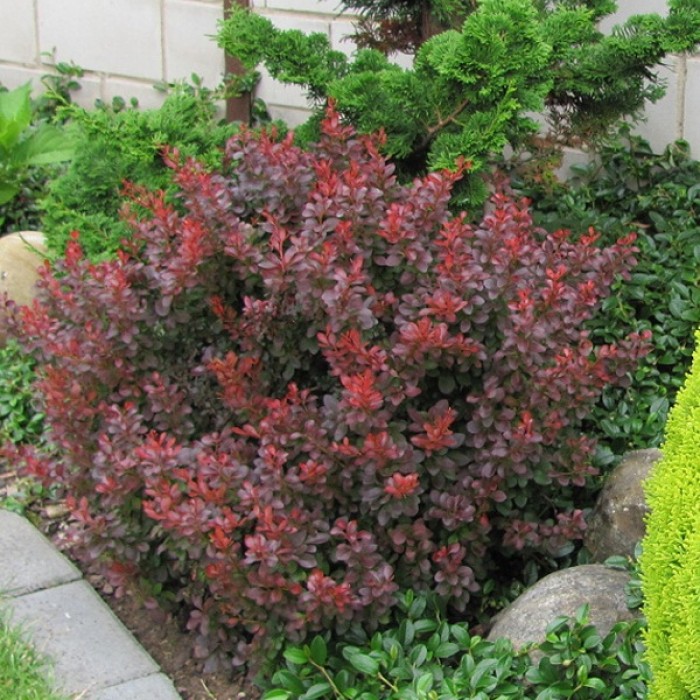 Саженцы кустарника барбариса Атропурпуреа нана (Atropurpurea Nana) – это карликовый подушковидный сорт, высота которого не превышает 60 см, а диаметр может доходить до 1 метра. Листья растения имеют яйцевидную форму и пурпурно-коричневый оттенок, появляются на ветках ранней весной. Осенью листья становятся ярко-красными. Цветки кустарника собраны в соцветия, они округлые желтые внутри и красные с внешней стороны, размер достигает 1см. Часто растение применяется в групповых насаждениях или в смешанных композициях, используется для формирования бордюров и живых изгородей. Отлично переносит стрижку и обрезки. Сорт Атропуупуреа нана высаживается на солнечные места и хорошо переносит несильную тень, но в тени листья сразу начинают зеленеть.