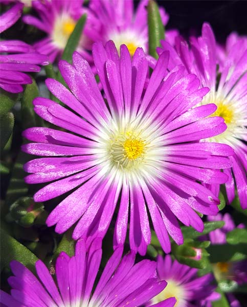 Саженцы Делоспермы Купера Сантропик Парпл (Suntropic Purple) разрастаются в плотные ярко-зеленые куртины, состоящие из узких мясистых стеблей и листьев, растущих вверх. В мае на растении появляются многочисленные цветки с узкими лепестками. Цвет их пурпурно-лиловый, у основания ярко-желтый. Цветение обильное, длится более месяца.