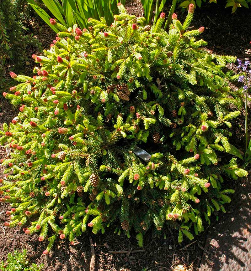 Саженцы Ели обыкновенной Акрокона Пуш (Acrocona Push) – это вечнозеленый, похожий на шар, миниатюрное дерево, которое за первые 10 лет вырастает 1 метр в высоту и ширину. Ель с крепкими, мощными отростками, которые имеют салатовый цвет, когда еще молодые. Жесткая, щетинистая, темно-зеленая хвоя растет до 2 сантиметров длиной. Ель обыкновенной Акрокона Пуш рано приносит плоды, которые сначала красные, а позже становятся бледно-розовыми или ярко-фиолетовыми. Если шишки остались висеть до весны, их нужно убрать для формирования новой завязи. Дерево неприхотливо и не занимает много места. Живет до половины века.