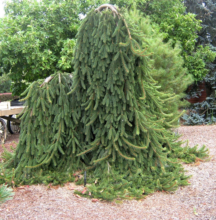 Саженцы Ели обыкновенной Пендула Майор (Pendula Major) – это высокорослое сильное дерево, которое вырастает до 18 метров в высоту и имеет диаметр кроны 2-2,5 метра. Верхушка дерева узкая и плакучей. Ветви и отростки висят, а нижние простираются по земле. На стволе имеются сучья. У дерева плотная, зеленая хвоя, которая растет полурадиусом.