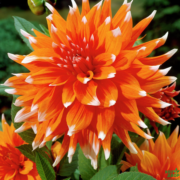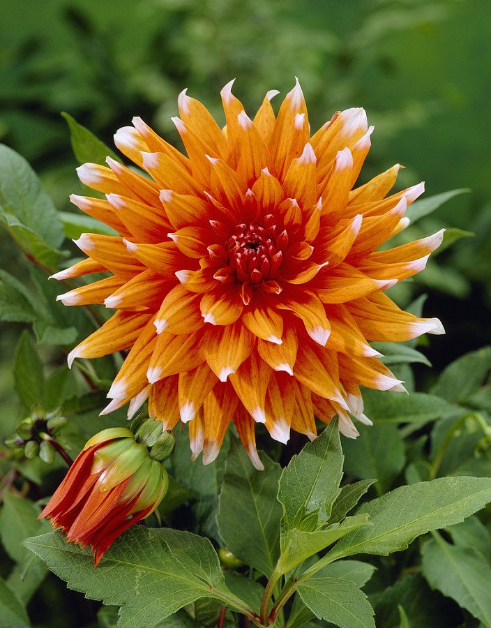 Луковицы георгины Color Spectable предпочитают расти на легких питательных почвах. Месторасположение — полное солнце. Это компактный сорт, который достигает в высоту до 90 см, а в ширину — до 45-60 см. Цветки очень красочные, махровые, насыщенного оранжево-красного цвета с белыми кончиками. Соцветие-корзинка в диаметре достигает до 25 см. Период цветения длится с июня — июля до наступления осенних заморозков. Георгины Color Spectable прекрасно смотрятся в одиночных посадках и вместе с другими многолетниками. На зиму клубни рекомендуют выкапывать и помещать в прохладное сухое место.