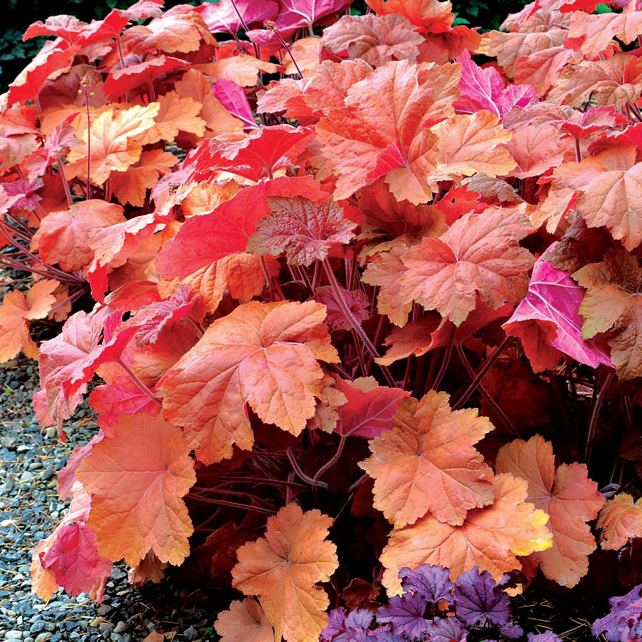 Рассада гейхеры Саузен Комфорт (Southern comfort) обладает крупными листьями, которые имеют персиковый, медный расцвет. К осени листья становятся золотого окраса. Растение небольшое, вырастает до 40 см в высоту, а в диаметре составляет 60 см. Цветет маленькими кремовыми цветами. Плюсы:
