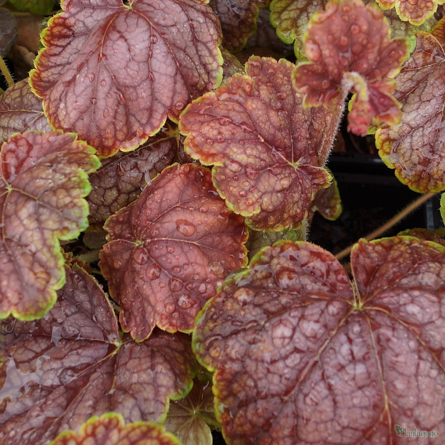 Рассада гейхеры Мастер Пеинтер Пикассо (Master Painter Picasso) порадует невероятно красивой окраской. По краям янтарно-бордовых листьев имеется золотистая каемка, а на поверхности проступают темные прожилки. Во второй половине лета среди листвы появляются высокие цветоносы с кремовыми соцветиями.