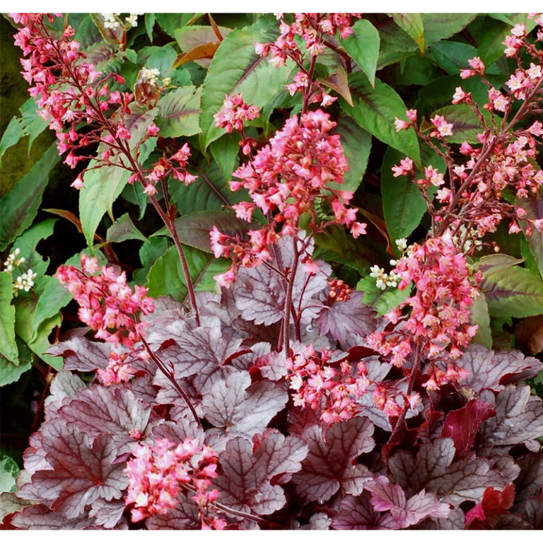 Рассада гейхеры Милан (Milan) послужит ярким украшением любой смешанной посадки. Этому сорту характерна необычная бордово-красная окраска. Невысокие кусты особенно эффектно смотрятся во второй половине лета, когда среди листвы появляются стебли с розовыми соцветиями. Многолетник сочетается с розами, баданом, лилейником и декоративными осоками.