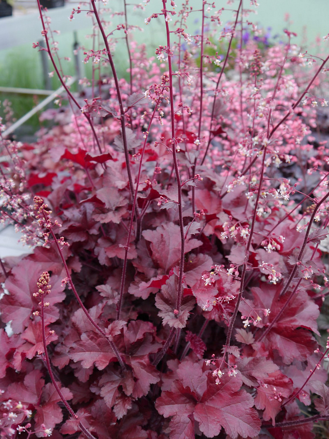 Рассада гейхеры Ред Си (Red Sea) ценится за высокую декоративность, которую обеспечивают гофрированные листья, окрашенные в багряные, красные и рыжие тона. В начале лета среди листвы пробиваются многочисленные цветоносы с маленькими кремовыми соцветиями, которые украшают кусты до августа. Многолетник отлично сочетается с геранями, баданом и примулами.