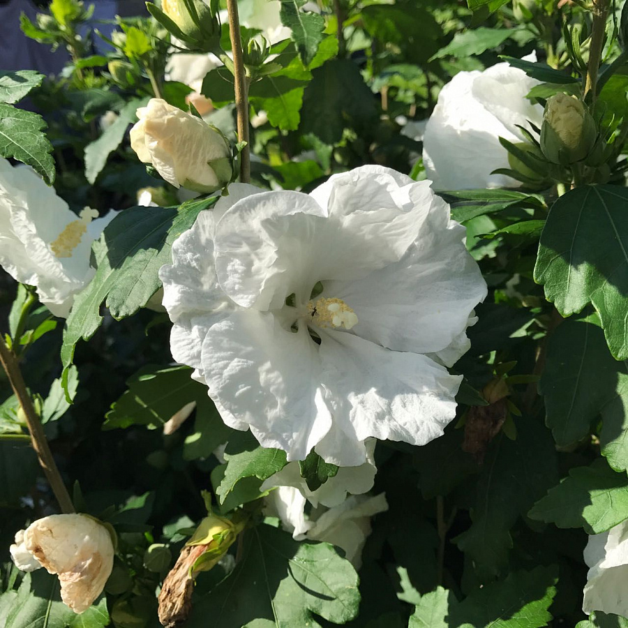 Саженцы гибискуса Вильям Р. Смит (William R. Smith) имеют прямостоячие, крепкие стебли и вырастают в раскидистый куст около 2 метров в высоту. Листва имеет насыщено-зеленый тон, широкую, трехлопастную форму. В июне цветет крупными цветами около 11 см в диаметре. Цветение махровое, белого окраса. Преимущества гибискуса Вильям Р. Смит: - редко болеет - хорошо переносит заморозки - достаточно засухоустойчивый Крупномеры гибискуса Вильям Р. Смит цветут крупными цветами на солнечных местах, а в полутени может быть намного меньшее цветение. Поливать рекомендуется в жару, но никоем случае не переливать.