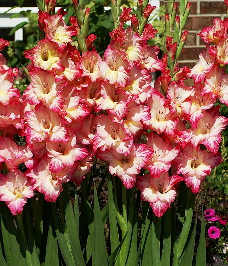 Шикарный гладиолус гибридный Присцилла (Priscilla) с чудесными бархатистыми цветками обладает таким богатым соцветием, что может затмить любой букет. Бледно-розовый оттенок цветка плавно превращается к краю в малиновый. Края каждого цвета сильно гофрированы. Соцветие высотой до полуметра, высота цветоноса – около 120 сантиметров. Предпочитает цвести в открытом грунте на открытых солнечных площадках в середины лета. Цветы крупные, на одном стебле может постепенно открыть до 15 бутонов. Великолепно смотрится в миксбордерах и на отдельных клумбах. Почву желательно обильно поливать во время цветения.