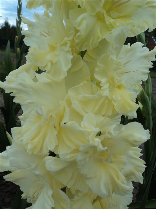 Гладиолус крупноцветковый "российская селекция" сгущеное молоко - это изысканное растение, которое поразит вас своей красотой и изысканностью. Стебель гладиолуса прочный и прямой, достигает высоты до 150-160 см, что делает его заметным акцентом в вашем саду. Цветки этого гладиолуса имеют светло-кремово-лимонную окраску, а три нижних лепестка украшены ярко-желтым оттенком, создавая неповторимый контраст.