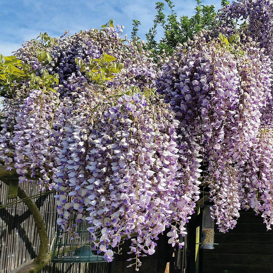 Саженцы глицинии китайской Глициния китайская Prolific пользуются популярностью у садоводов и дизайнеров садовых ландшафтов благодаря невероятной декоративности. Это растение представляет собой дерево высотой около 6 метров, ветви которых заканчиваются тонкими лианами. В середине мая и в конце лета на ветвях-лианах распускаются нежные голубовато-фиолетовые цветы.