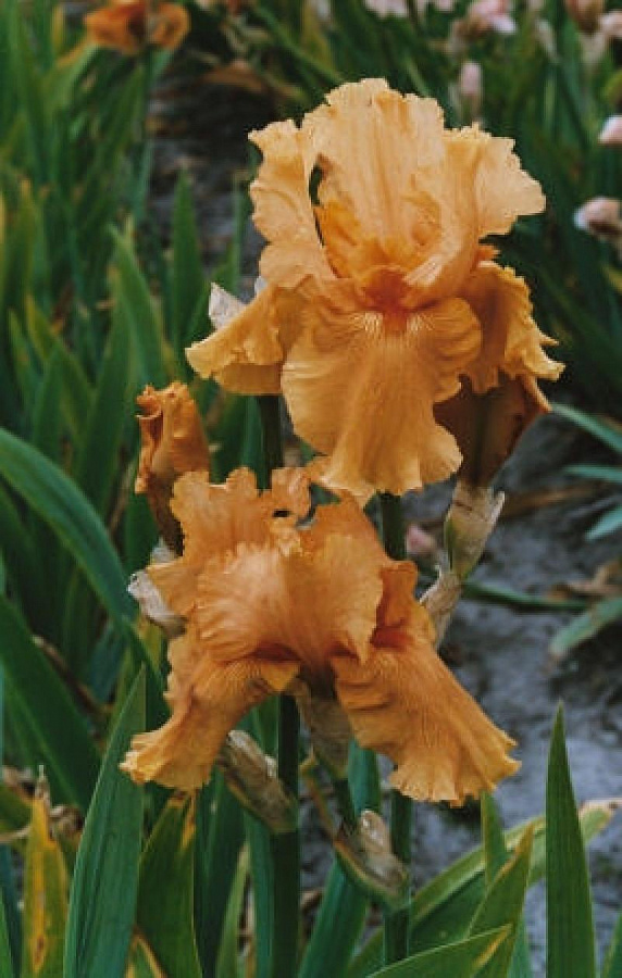 Ирис бородатый Skyfire - это настоящий огненный шторм в вашем саду! Ярко-оранжевые цветы с коричневыми прожилками будут словно пламенем, разгорающимся на фоне зеленых листьев. Это растение поражает не только своей красотой, но и своей изысканной формой листьев, которая придает ему особый шарм и уникальность.