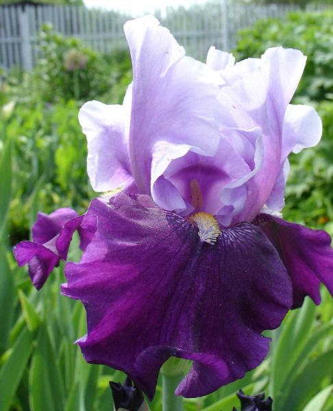 Цветок ириса германского Вино голубой птицы двухцветный: верхние лепестки сиреневые, а нижние темно-лиловые. Более эффектно смотрятся в групповых посадках с другими сортами этого растения. Семенами размножается трудно, поэтому лучше рассаживать корень.