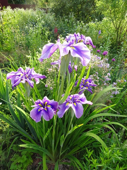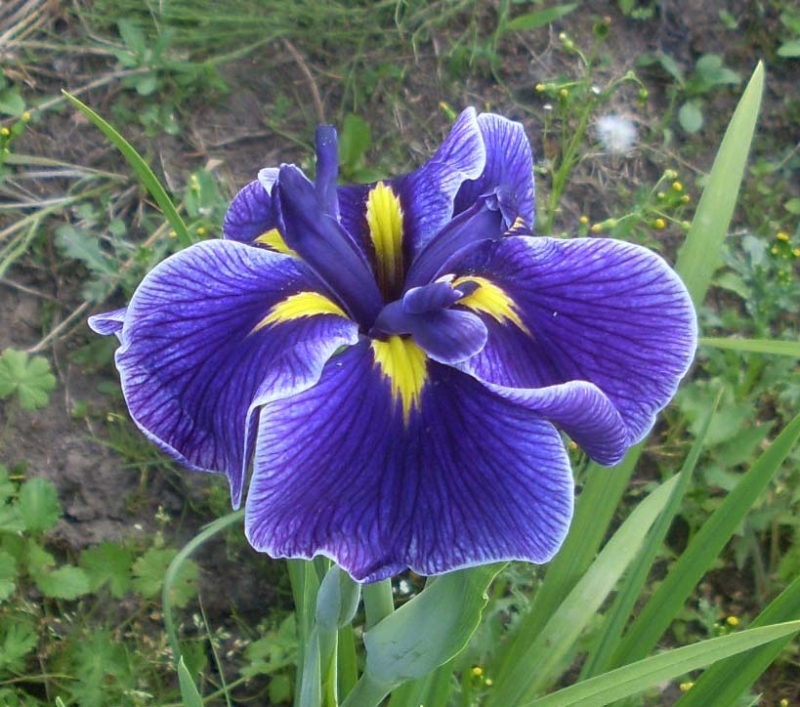 Саженцы ириса японского Кристал Хало (Iris ensata Crystal Halo) – мечевидный многолепестковый сорт с роскошными грациозными цветами. Высота стебля – до 1 метра. Цветение – периодами, с июня по август включительно. На каждом распускается 3 цветка диаметром 12-15 сантиметров. Каждый состоит из двух рядов лепестков. Верхний ряд – ярко-фиолетовый, иногда с белым крапом. Нижние лепестки – круглые, с белым кантом, яркими прожилками и ярко-желтой полоской по центру каждого лепестка. Растение – светолюбивое. При высадке в солнечных местах наблюдается обильное образование цветочных почек и цветение.