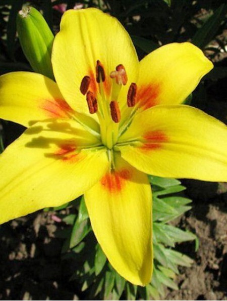 Окраска цветка : жёлтый с красным пятном у основания лепестка