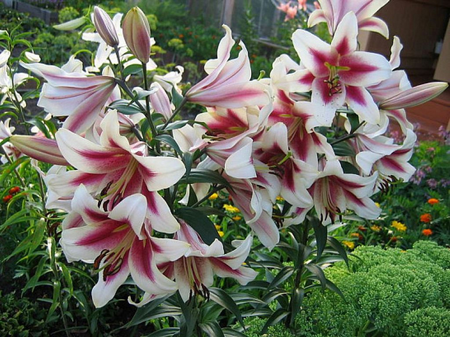 Лилия от-гибрид алтари - это великолепное растение с бело-кремовыми цветками, украшенными ярко-малиновым центром. Этот сорт лилии поражает своей изысканной красотой и изяществом. Высота растения может достигать до 110 см, а размер цветка радует глаз своими 20-25 см. Лилия altari идеально подходит для посадки на газоне, в групповых или одиночных посадках, а также в миксбордерах.