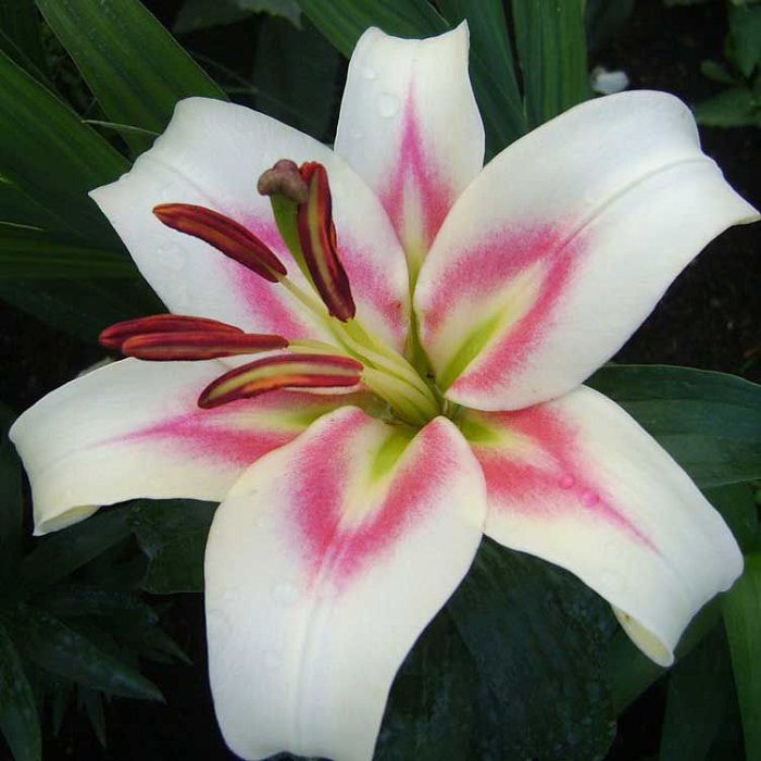 Лилия от-гибрид бонбини - это великолепное растение, которое поразит вас своей красотой и изысканностью. Ее стебель достигает высоты до 90-100 см, а цветки имеют размер впечатляющих 25 см. Лепестки белого цвета с бордовым оттенком создают неповторимый вид, а желто-зеленое горлышко придает цветку особую изюминку.