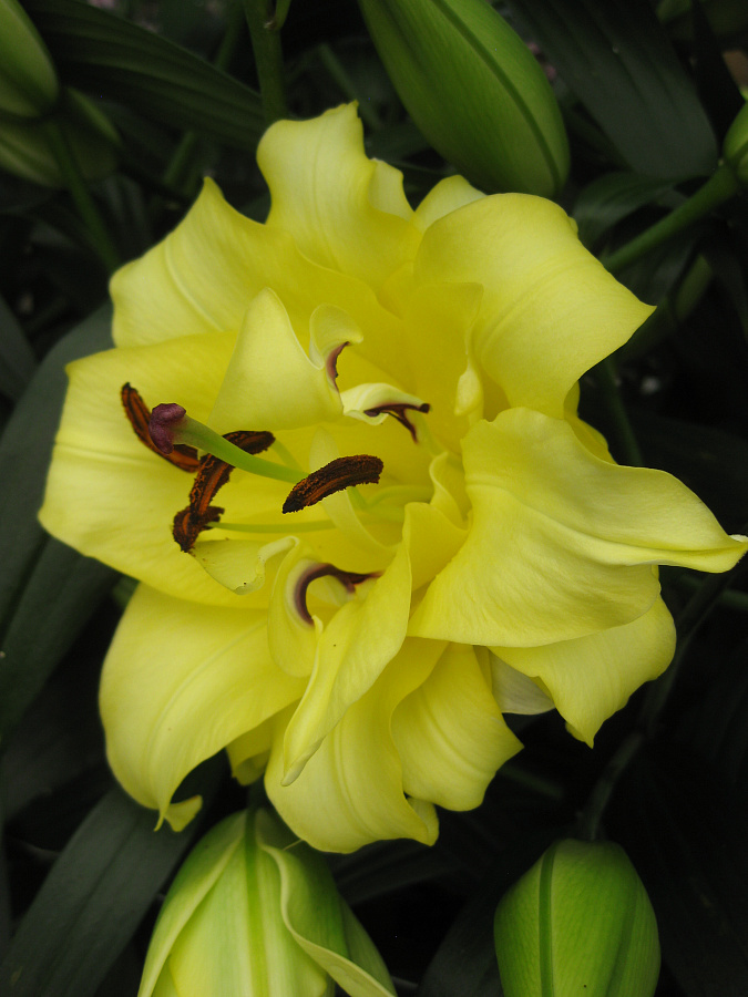 Луковицы лилии восточной махровой Экзотик Сан (Lilium Exotic Sun) — солнечное украшение любого сада или букета. Сорт запоминается своими крупными (до 20 см в диаметре) цветами насыщенного желтого оттенка. Лепестки однотонные, очень широкие и махровые, с ажурными краями. Они распускаются в конце лета, очень пышные и ароматные. Взрослое растение достигает 100 см в высоту. Лилии могут находиться в открытом грунте в течение всего года, при этом их не нужно пересаживать минимум 3–5 лет. В течение лета их достаточно поливать и подкармливать, а на зиму — укрыть от морозов. Цветущие стебли стоит срезать для букетов — они очень прочные и долго не увядают в вазонах.