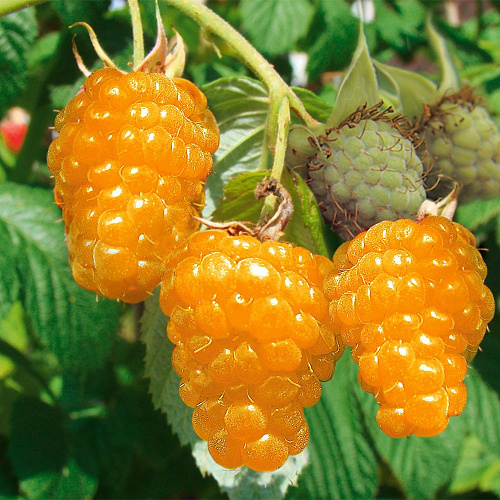 Саженцы малины обыкновенной Жёлтый гигант одни из любимых у бывалых садоводов. Ароматная ягода этого сорта, будет радовать вас и ваших детей до поздней осени. Подходит людям, страдающим аллергией. Куст Жёлтого гиганта раскидистый, достигает 2,5м высотой и требует опоры. Созревает уже в начале июля и имеет возможность повторить урожай осенью. После сбора ягод, кусты лучше обрезать. Жёлтый гигант устойчив к вредителям и болезням. На зиму желательно пригибать и укрывать. Крупномер сорта Жёлтый гигант идеально высаживать осенью в хорошо освещённое место, на глубину 50см. Желательно заложить слой компоста.
