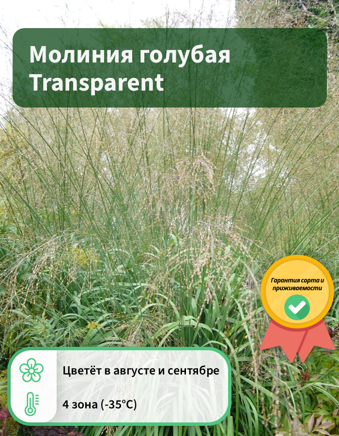 Рассаду молинии голубой Transparent (Molinia caerulea) используют в ландшафтном дизайне для оформления газона, композиций с камнями, береговой зоны, выращивания в контейнерах. Растение в высоту разрастается до 60-90 см. Листья молинии голубой Transparent зеленые или серо-зеленые, до 12 мм шириной, осенью приобретают золотисто-желтый цвет. Зацветает многолетник в августе. Соцветия-колоски ажурные, прозрачные, редкие. Выращивать декоративный злак рекомендуют на сырых, прохладных, полутенистых или полностью затененных местах.