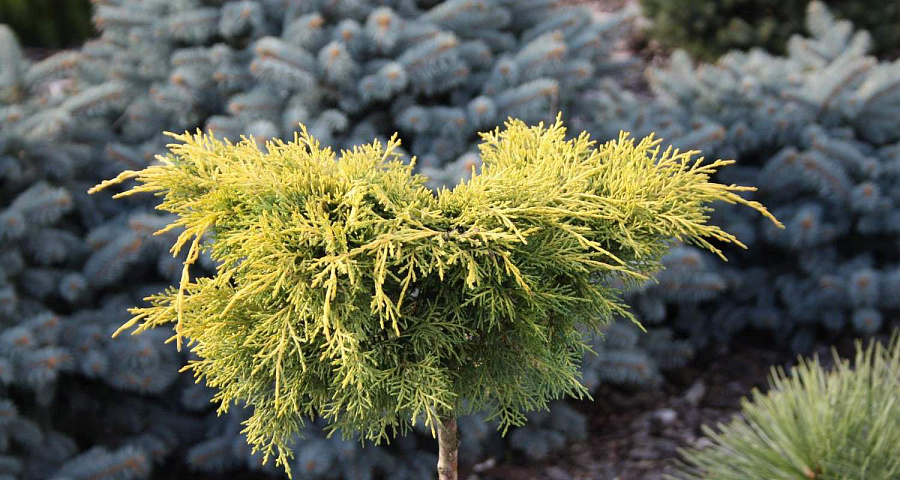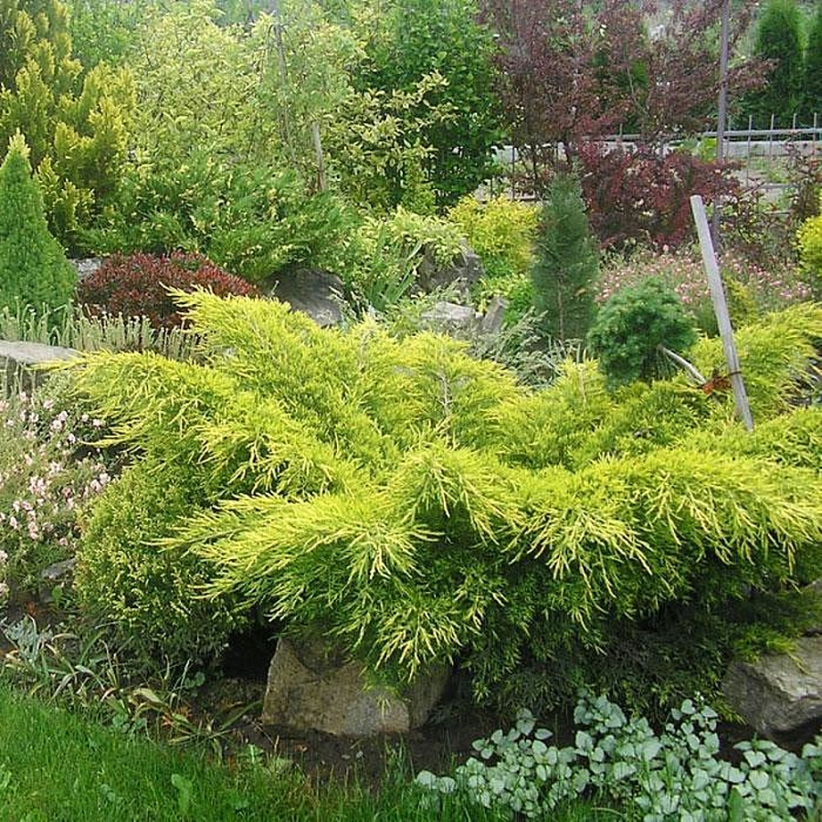 Саженцы можжевельника среднего довольно быстро растут, достигая при свободной посадке в возрасте 10 лет до одного метра в высоту. Диаметр кроны может быть до двух метров и больше. Растения нетребовательны к почве и влаге. Сажать их можно на солнце или в полутени. Крона вначале распростертая, потом приподнимающаяся. Хвоя двух типов, частично чешуевидная и игловидная. В период роста она светло-зеленая, потом немного темнеет. Оттенок хвои сизый, могут присутствовать разные тона. Используют саженцы можжевельника среднего в одиночных и групповых посадках на фоне газона, альпинариях, каменистых садах.
