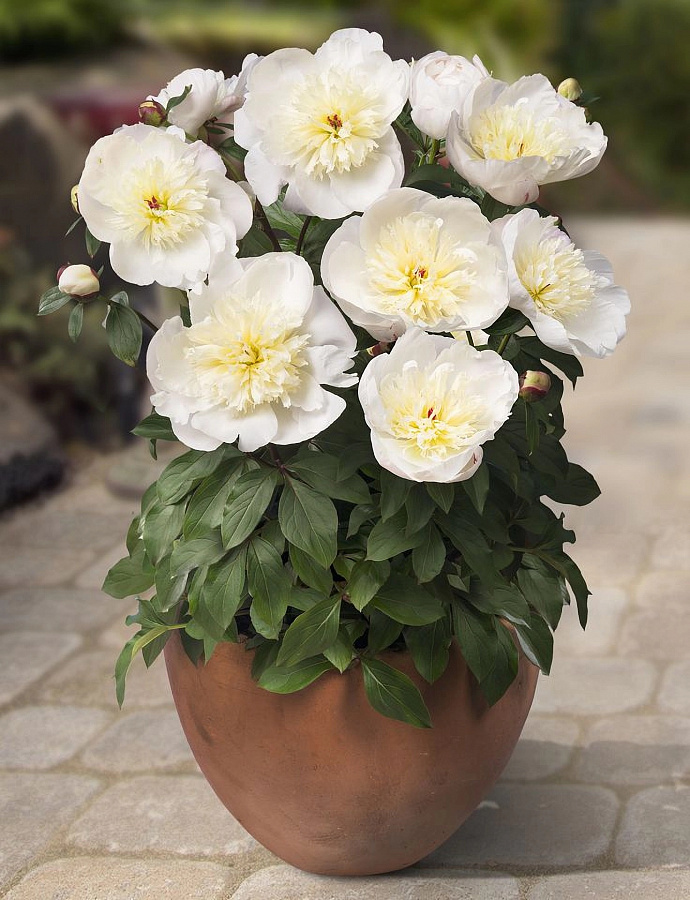 Луковицы пиона для патио Мадрид относятся к травянистым молочноцветковым гибридам, выведенным в США. Растение станет роскошным украшением сада, террасы или даже балкона. Его небольшие размеры (в высоту взрослый куст не превышает 30 сантиметров) позволяют выращивать пион даже в кашпо в комнатных условиях. Мадрид характеризуется заостренными листьями и полумахровыми белоснежными цветами с крупными лепестками, расположенными в два ряда. Центр цветка украшают золотистые тычинки. Достойную компанию пиону могут составить другие виды из сортовой серии пионов для патио.
