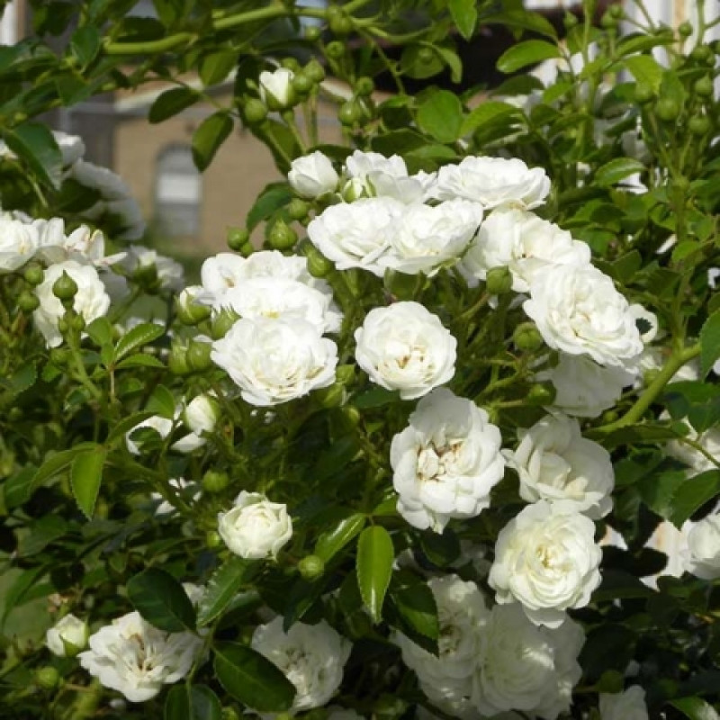 Саженцы розы флорибунда Сноувайт (Snow White) относятся к декоративным кустарникам, подходящим для оформления бордюров, озеленения участка и срезки. Лучше всего сажать куст в групповых посадках. Это один из лучших сортов среди белых роз. Растение предпочитает расти на рыхлых суглинистых почвах с плодородным грунтом. Высота куста достигает до 60 сантиметров. Цветочки среднего размера, диаметром 4-7 сантиметров. Лепестки белоснежного оттенка, ближе к центру – кремового. В одном соцветии – 5-6 цветков. Бутоны распускаются в июне. Прекращает роза цвести к сентябрю.