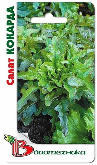 Семена салата "Кокарда" (Kokarda) позволяет получать зелень, обладающую декоративным видом и интересным вкусом. Чтобы получать крупные листья, культуру необходимо выращивать рассадным способом. Растение представляет собой листьевую розетку, которая достигает в высоту 20-25 см, а в диаметре – 30-35 см. Листья длинные, с долями, окрашены в насыщенный зеленый цвет, но по краям присутствует бронзово-бардовая каемку. Благодаря такой окраске розетка напоминает перья. Листья обладают приятным вкусом без горечи. Используется зеленая масса для приготовления свежих овощных салатов.