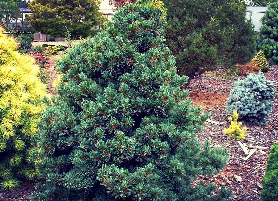• Японских садах. У растения образуются шишки характерного красноватого цвета, красиво смотрятся на фоне голубовато-зеленых иголок, которые имеют скрученную форму и собраны в пучок. Растет медленно и постоянной формы кроны не имеет. Достигает высоты 4 метра в возрасте 30 лет.