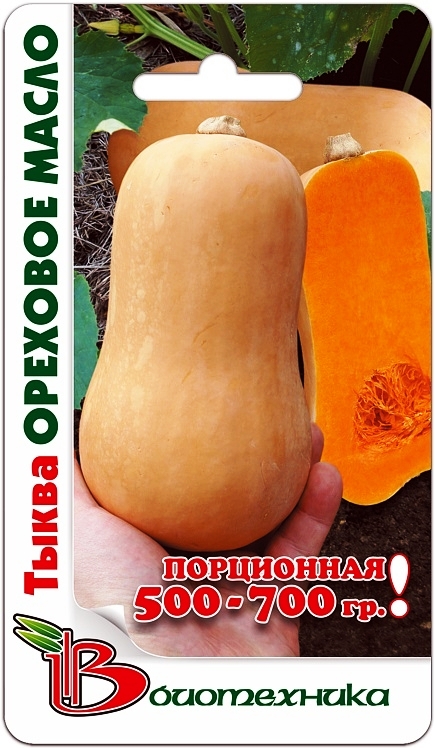 Семена тыквы "Ореховое масло" (Orehovoe maslo) сеют на рассаду в апреле. Высадку в открытый грунт производят в мае. Также сорт подходит для непосредственного посев сразу на постоянное место в середине – конце мая. Плоды созревают через три месяца после появления массовых всходов. На мощном, плетистом растении формируется до 30 тыковок. Плоды характеризуются грушевидной формой, кожица окрашена в кремово-бежевый цвет. Мякоть ярко-оранжевого окраса, плотная, маслянистая с ярким ореховым привкусом. Используют урожай для различных переработок.
