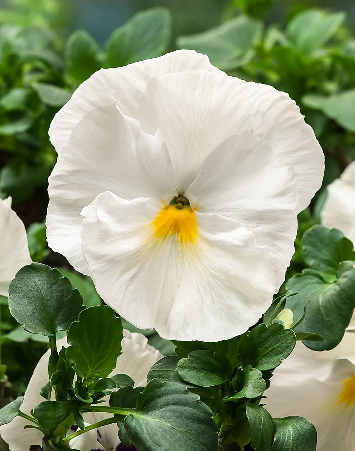 Виола крупноцветковая колоссус вайт - это изысканное растение с белыми цветками, которое поражает своей красотой и изяществом. Ее стебель тонкий и гибкий, достигает высоты до 10-12 см, что делает ее идеальным выбором для групповых или одиночных посадок. Листья виолы зеленые, создавая прекрасный контраст с яркими цветками.