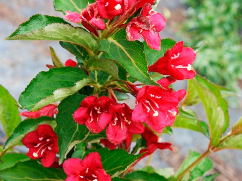 Саженцы Вейгелы Люцифер (Lucifer, Weigela) – декоративный лиственный кустарник, достигающий в высоту 150 см. В период цветения, которое приходится на июнь-сентябрь, покрывается крупными воронковидными или трубчато-колокольчатыми цветками. В процессе цветения окраска лепестков меняется от светло-кремовой до красной. Аромат цветов вейгелы приятный, легкий.