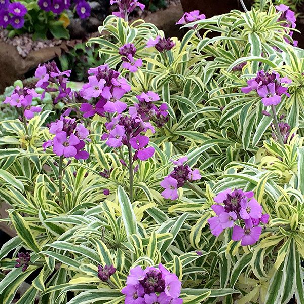 Рассада желтушника Вариегатум (Variegatum) имеет продолговатые листочки с желтоокаймленным окрасом. Вырастает в высоту около 30-40 см. Быстро разрастается и образует плотные кустики. В мае и июне радует своим цветением фиолетового цвета. Цветы нежные и мелкие. Преимущества желтушника Вариегатум: